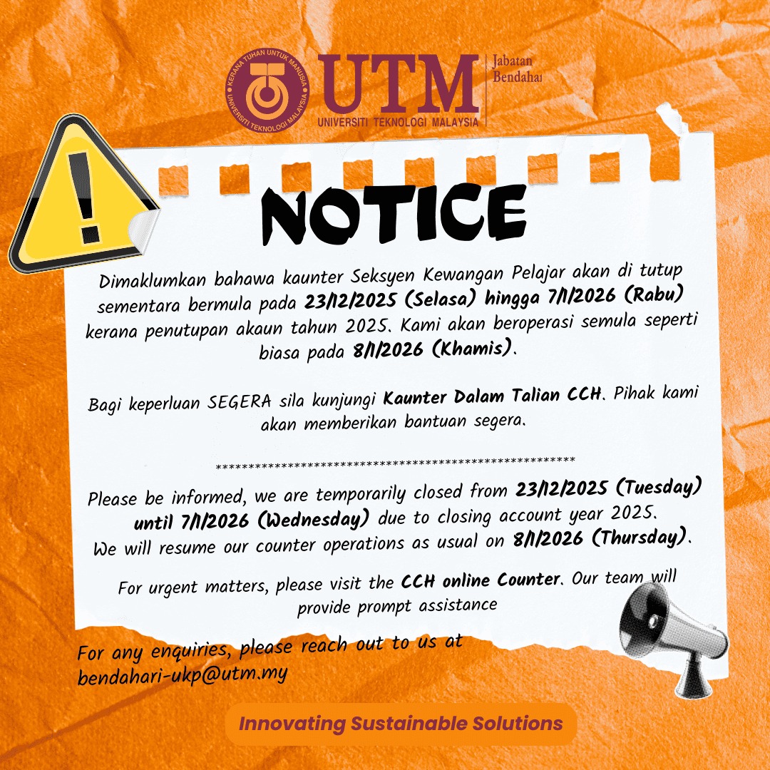 Kaunter Seksyen Kewangan Pelajar akan ditutup sementara bermula 23 Disember 2025 (Selasa) hingga 7 Januari 2026 (Rabu) berikutan penutupan akaun tahun 2025. Operasi kaunter akan disambung semula seperti biasa pada 8 Januari 2026 (Khamis).